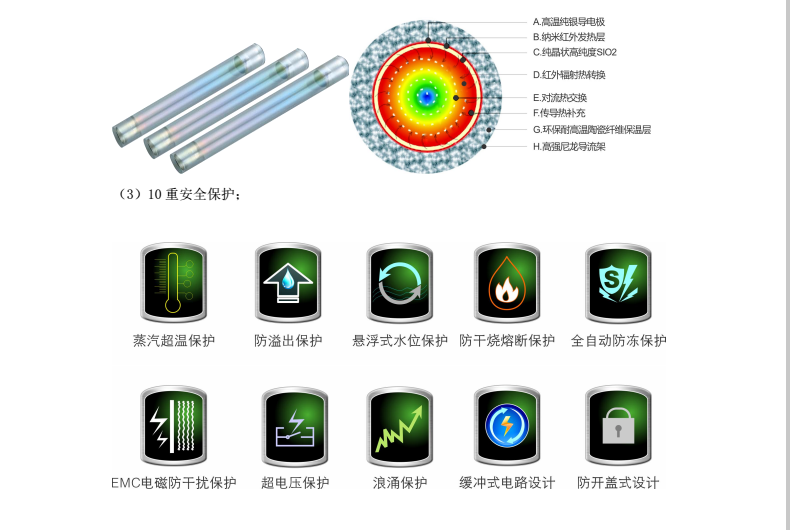 (4)10重安全保護(hù):防蒸汽超溫、溢出、干燒、沖擊、防凍、超電壓、浪涌、電磁干擾、開蓋式設(shè)計(jì)及懸浮式水位保護(hù);