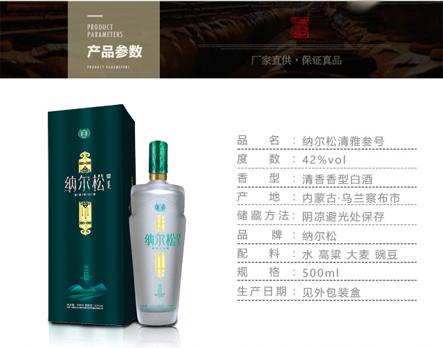 納爾松釀業(yè)推出的清香型白酒系列產(chǎn)品面世至今,主要用于飲用,市場反應(yīng)強烈,得到全國;內(nèi)蒙古烏蘭察布;內(nèi)蒙古烏蘭察布集寧區(qū)廣大需求群體的高度關(guān)注。我們有全新的產(chǎn)品,高標(biāo)準(zhǔn)的批發(fā);零售;網(wǎng)上銷售促使您全年有興旺的生意,豐厚的利潤。