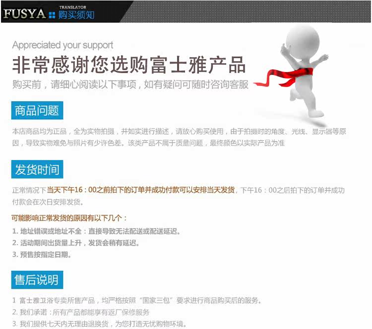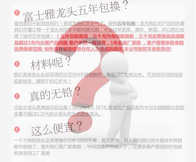 以下是產(chǎn)品全家福,親購買的產(chǎn)品由下圖一覽無余,配件齊全,買回安裝即可使用,新裝修房屋要先排清墻體內(nèi)管雜質(zhì)再安裝哦。以免堵住龍頭影響出水效果。(詳情見說明書)