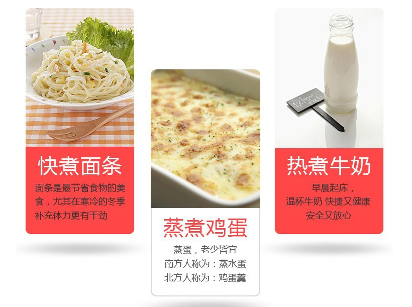 1、風靡韓國、臺灣、日本的多功能煮面器,不僅能夠燒開水,還能夠煮面條、做火鍋、蒸雞蛋、熱菜,甚至可以當著飯盒到食堂打飯,非常適合住校學(xué)生、白領(lǐng);