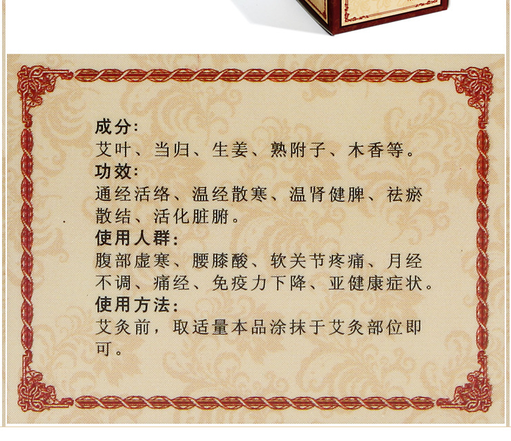成分:艾葉、當(dāng)歸、生姜、熱附子、木香等
