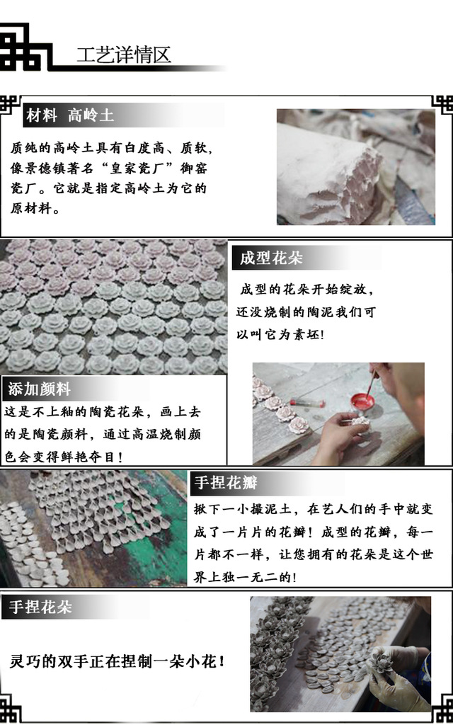 本店的陶瓷首飾均由陶瓷藝人純手工制作,經(jīng)過(guò)復(fù)雜的工藝、高溫?zé)裏挾桑抢L畫藝術(shù)、手捏藝術(shù)、雕塑藝術(shù)以及窯火技藝的完美結(jié)合,每一件陶瓷首飾,都是一件精美的陶藝品。