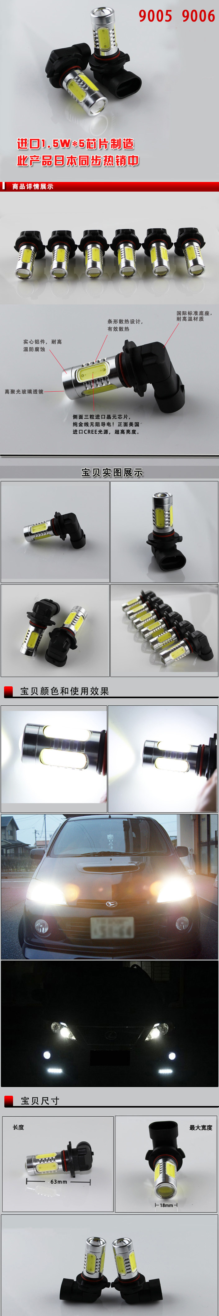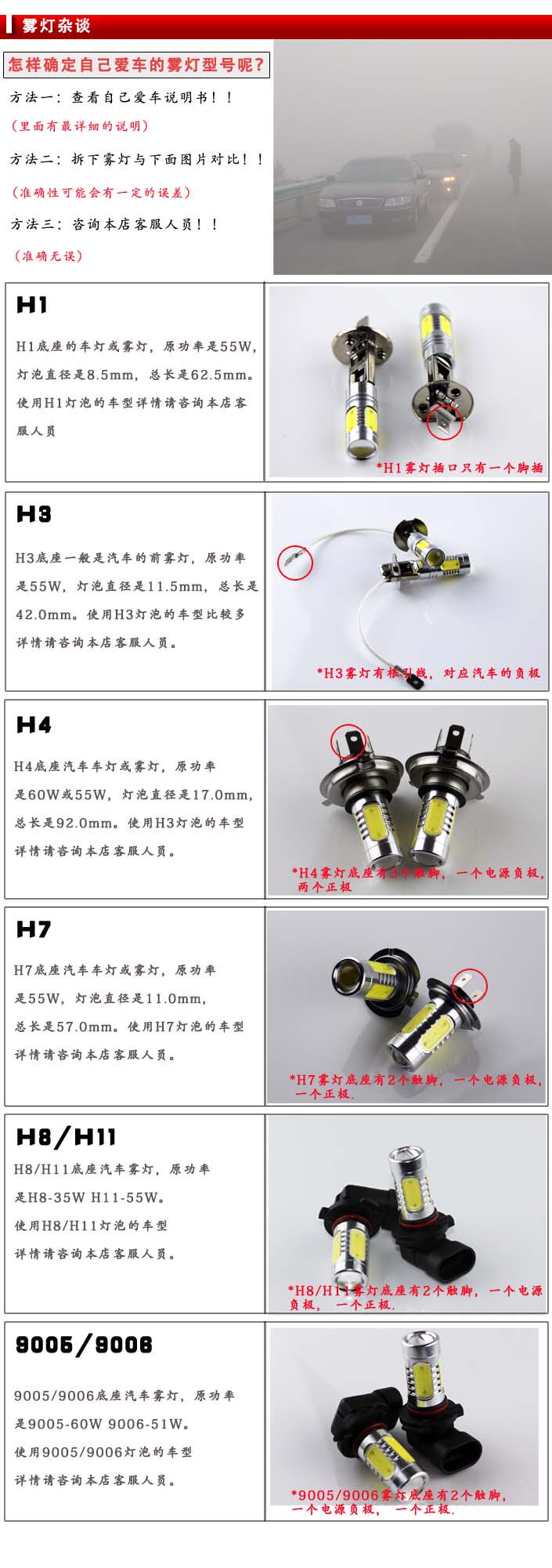 注 意:本LED霧燈替換普通燈泡起到美觀的效果(對面看過來亮,好看,)讓別人更容易注意到您,LED霧燈能耗低,不發(fā)熱是優(yōu)點,亮度與原車的霧燈鹵素?zé)襞莶畈欢?,要求超高亮度像大燈一樣照射很遠(yuǎn)的效果的客戶請繞道.