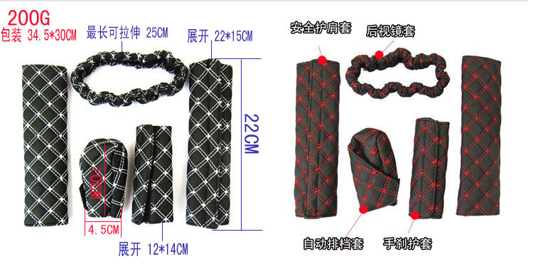 【規(guī)格】手剎 12*14CM 檔套 10*4.5CM 后視鏡套:長可拉伸25CM(標準尺寸為25CM,后視鏡尺寸大于25CM的車主,請慎重考慮哦^_^) 安全帶護肩:22*15CM