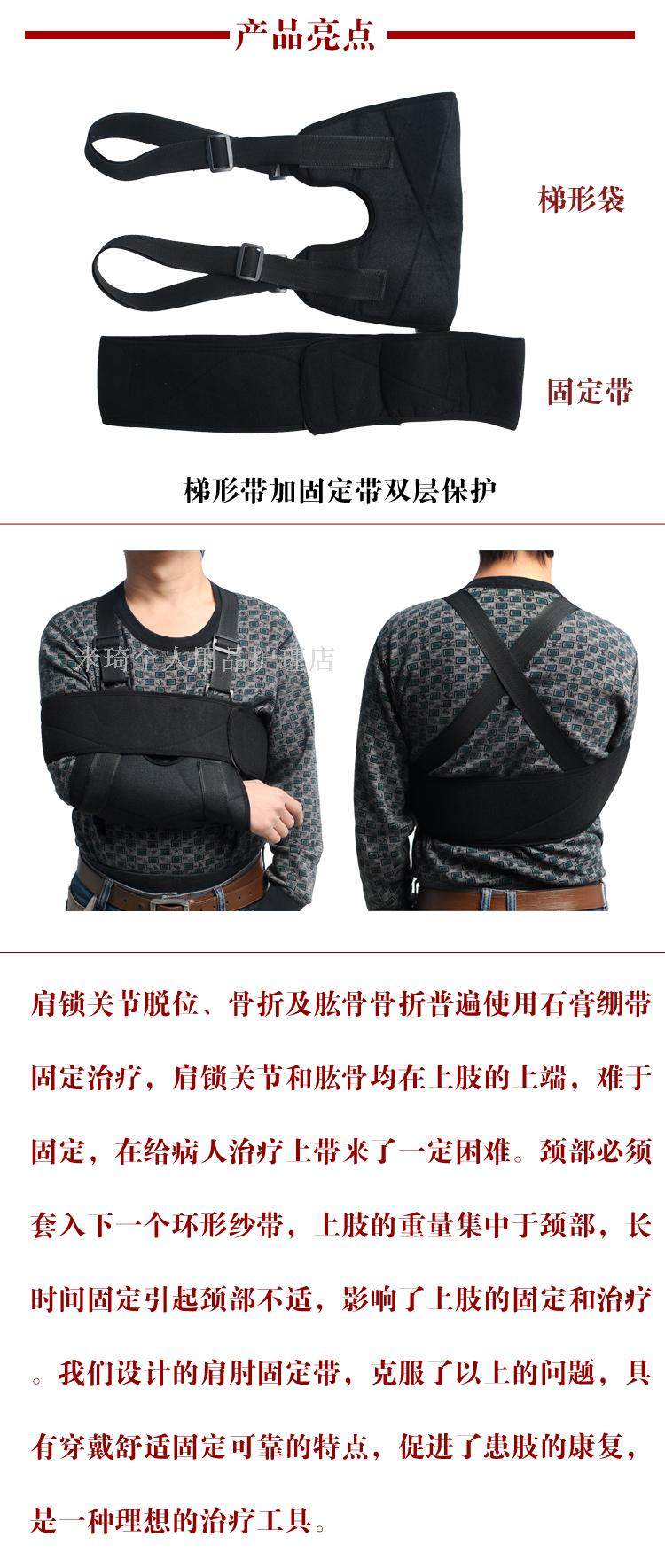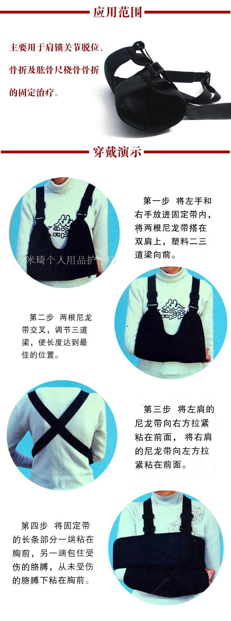 本品由梯形袋和固定帶兩件組成,使用說明如下: 1、將患肢前臂穿入梯形袋,梯形袋上側兩端的背包帶格子通過同側肩膀在背部交差后,分別穿過腋下、梯形袋底部,與梯形袋前面的尼龍袋面布粘連。這樣固定使上肢的重量集中在雙肩上,且梯形袋上背包帶的伸縮可調(diào)節(jié)肘關節(jié)角度,使上肢固定在一個舒適的位置。 2、固定帶內(nèi)外二層,外層由尼龍粘帶與布構成。內(nèi)層由全棉絨布制成。內(nèi)層兩端縫有尼龍粘帶,先將固定帶一端內(nèi)層粘帶粘在梯形袋錢,然后把固定帶沿患肢、胸背部從雙側腋下繞一圈,重疊在固定帶上,將另一側內(nèi)層粘帶粘在固定帶外層尼龍袋布上,使患肢牢固固定。 3、肩肘固定帶必須在醫(yī)師指導下使用。 4、使用本品時,若患肢出現(xiàn)腫脹,疼痛加重、麻木,應立即去醫(yī)院咨詢。 5、使用本品時,未遵醫(yī)囑,不可隨意除去。 6、本品不可熱水洗滌,不可曝曬。 7、本品必須存放在干燥通風處。