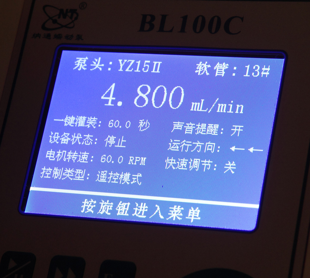 主界面通用特點(diǎn)1、具有一鍵灌裝功能,可以定時(shí)定量的進(jìn)行單次灌裝。2、具有自動(dòng)流量校準(zhǔn)功能,使得流量控制更,適合定量傳輸液體。3、可安裝多種泵頭:如YZ15Ⅱ、YZ25Ⅱ、MC4X、MC8X系列泵頭。4、無極調(diào)速,操作簡便直觀。5、采用“雙CPU”控制,驅(qū)控分離,運(yùn)算速度快,工作穩(wěn)定,傳輸精度高。6、設(shè)有全速按鈕:具有快速填充、排空功能。7、采用步進(jìn)電機(jī)控制轉(zhuǎn)速,不受負(fù)載變化的影響。8、大轉(zhuǎn)矩、低功耗,適應(yīng)性強(qiáng)。9、驅(qū)動(dòng)電路性能優(yōu)良,散熱性好,工作噪音小,運(yùn)行平穩(wěn),具有掉電記憶功能。BL300C蠕動(dòng)泵驅(qū)動(dòng)器技術(shù)參數(shù):