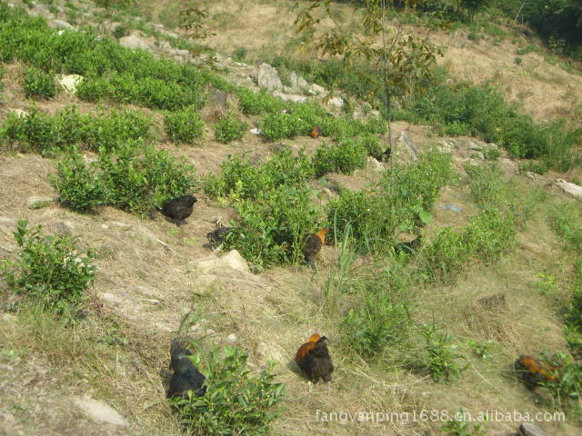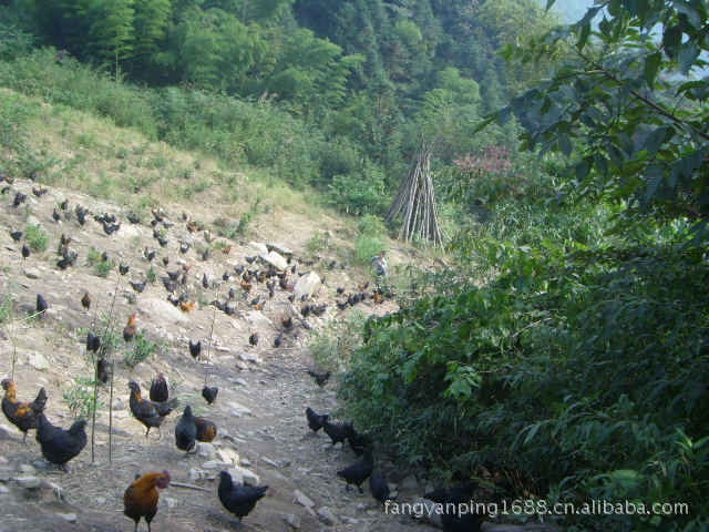 自家養(yǎng)的純種高山黑毛烏骨雞是放養(yǎng)在安吉龍王山海拔1200米的白茶園里。每天喂一次顆粒玉米,主要是以白茶園里的蟲草為食。此雞養(yǎng)殖400天出欄。其肉鮮嫩而有彈性,是真正的原生態(tài)雞。
