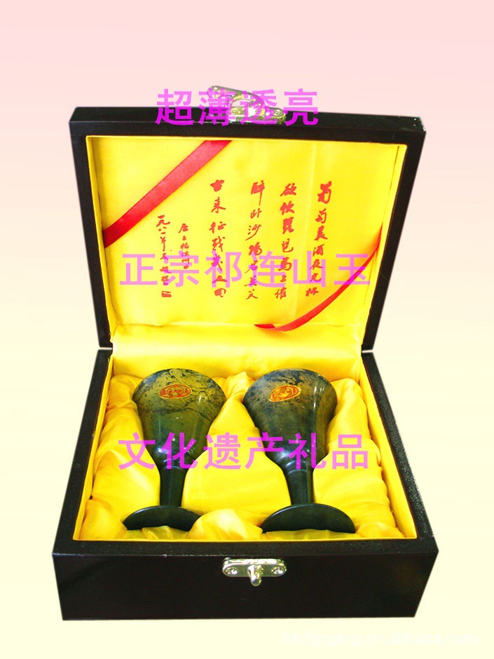 “敦煌夜光杯”造型獨(dú)特,式樣精巧,其色黑賽烏漆,白如羊脂,墨綠似翠,紋飾天然,杯薄如紙,光亮似鏡,內(nèi)外平滑,玉色透明。夜光杯不但含有多種對(duì)人體有益的礦物質(zhì),而且抗高溫,耐嚴(yán)寒。敦煌出產(chǎn)的夜光杯色澤有翠綠、鵝黃、羊脂白等,光澤長(zhǎng)久不變,造型豐富多彩,聲譽(yù)隆。帶有天然紋理,石色墨綠,薄如蛋殼、手感細(xì)膩,真有“一觸欲滴”的美妙效果。夜光杯質(zhì)地光潔,色澤斑斕,宛如翡翠,倒入美酒,酒色晶瑩澄碧。尤其皓月映射,清澈的玉液透過(guò)薄如蛋殼的杯壁熠熠發(fā)光。唐人王翰詩(shī)云“葡萄美酒夜光杯”,詩(shī)以杯出名,杯因詩(shī)增輝。敦煌出產(chǎn)的夜光杯色澤有翠綠、鵝黃、羊脂白等,光澤長(zhǎng)久不變,造型豐富多彩,聲譽(yù)隆。