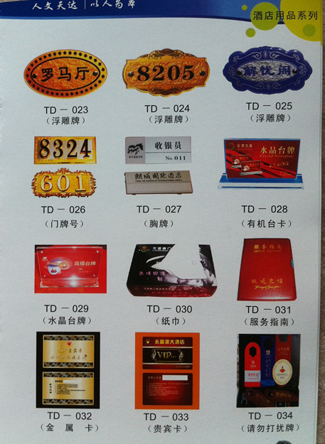 適用于各酒店、賓館等餐飲行業(yè),產(chǎn)品有:牙簽套,筷子套,貴賓卡,菜譜,洗滌用品,信封,收據(jù)單,工號(hào)牌,金屬胸牌,亞克力胸牌,酒店賓館員工胸牌等各種酒店用品,款式新穎,品種齊全,精美高檔,質(zhì)優(yōu)價(jià)惠,根據(jù)客戶要求訂做,歡迎來電咨詢