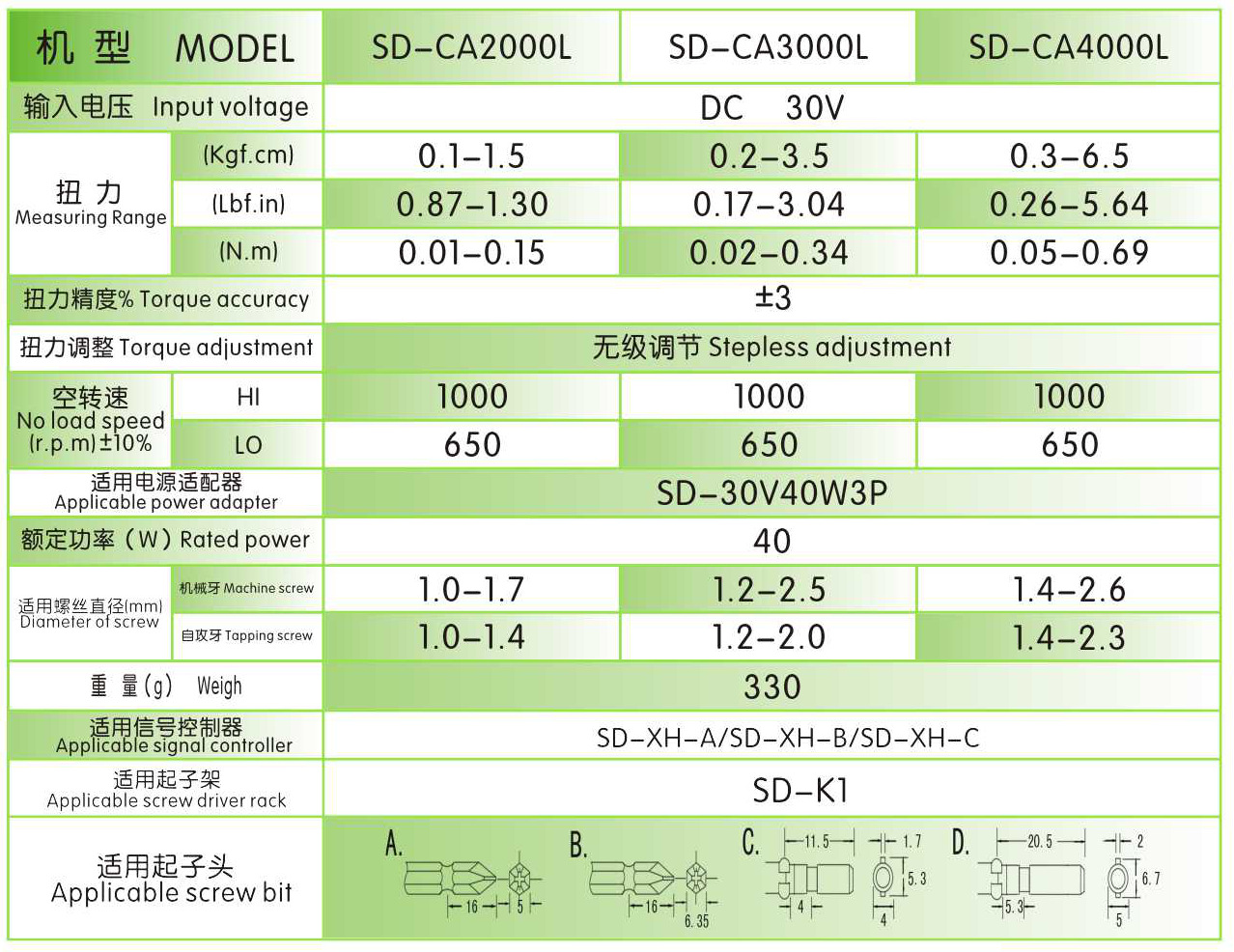 •操作簡單,扭力穩(wěn)定,提高工作效率,馬達長時間使用不疲乏,適合在流水線工作中使用。•可連接智能計數(shù)器,通過智能計數(shù)器檢測反映鎖付螺絲緊固情況及數(shù)量。•可外接PLC,讓作業(yè)更加人性化,使用電腦計算該擰緊的螺絲,避免不必要的漏鎖螺絲失誤。•體質小,重量輕,低噪音,采用流線型8~J*Jt-觀設計,性能穩(wěn)定,電機不需要保養(yǎng)與維護,起子可以長時間使用。•扭力調整由扭力調整環(huán)左右旋轉無級調節(jié),轉速可分Hi/Lo開關兩段調節(jié)。•扭力精度高,采用無級式扭力調整,操作簡單,適用于一般電子電器產(chǎn)品燈具、小家電、玩具、電腦周邊配件等加工裝配作業(yè)。