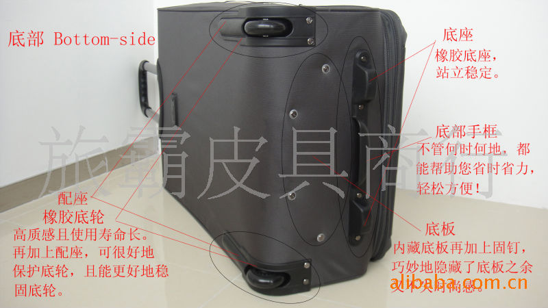 進(jìn)口尼龍臺灣防水料,鋁合金拉桿,橡膠耐性拉倫,底板堅(jiān)固,是居家旅行,出差的必備之品。