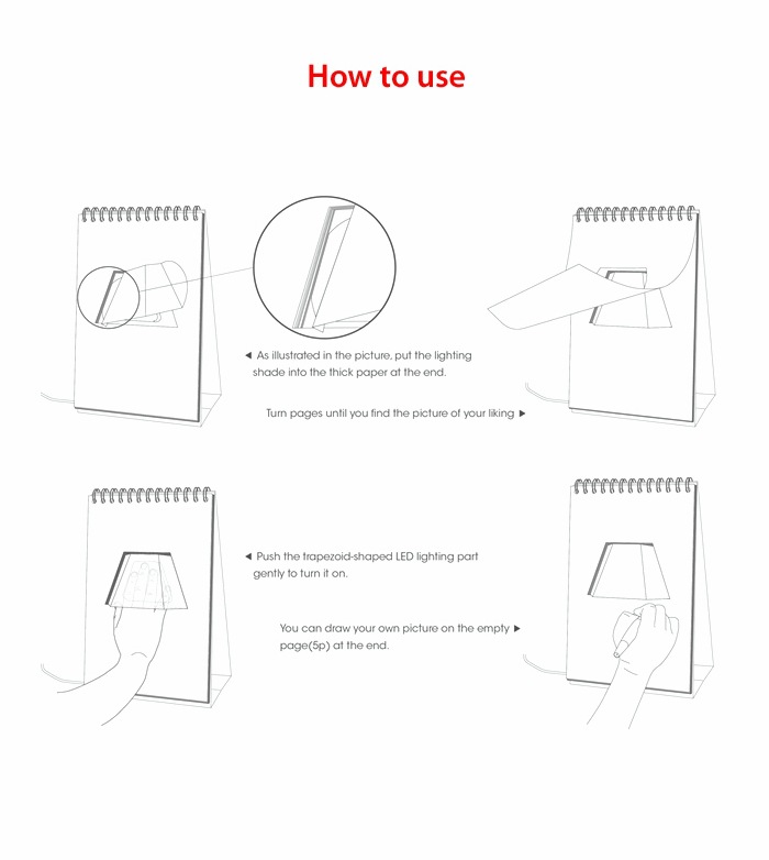 (Page by Page)翻頁(yè)燈的創(chuàng)意——我們可以將之理解為是是一顆嵌在臺(tái)歷上的LED臺(tái)燈,臺(tái)歷上的每一頁(yè)都有不同的圖片主題或者涂鴉,每翻動(dòng)一頁(yè),就連生活都好像一起翻開(kāi)了新的一頁(yè),整個(gè)世界都為之不一樣起來(lái)~