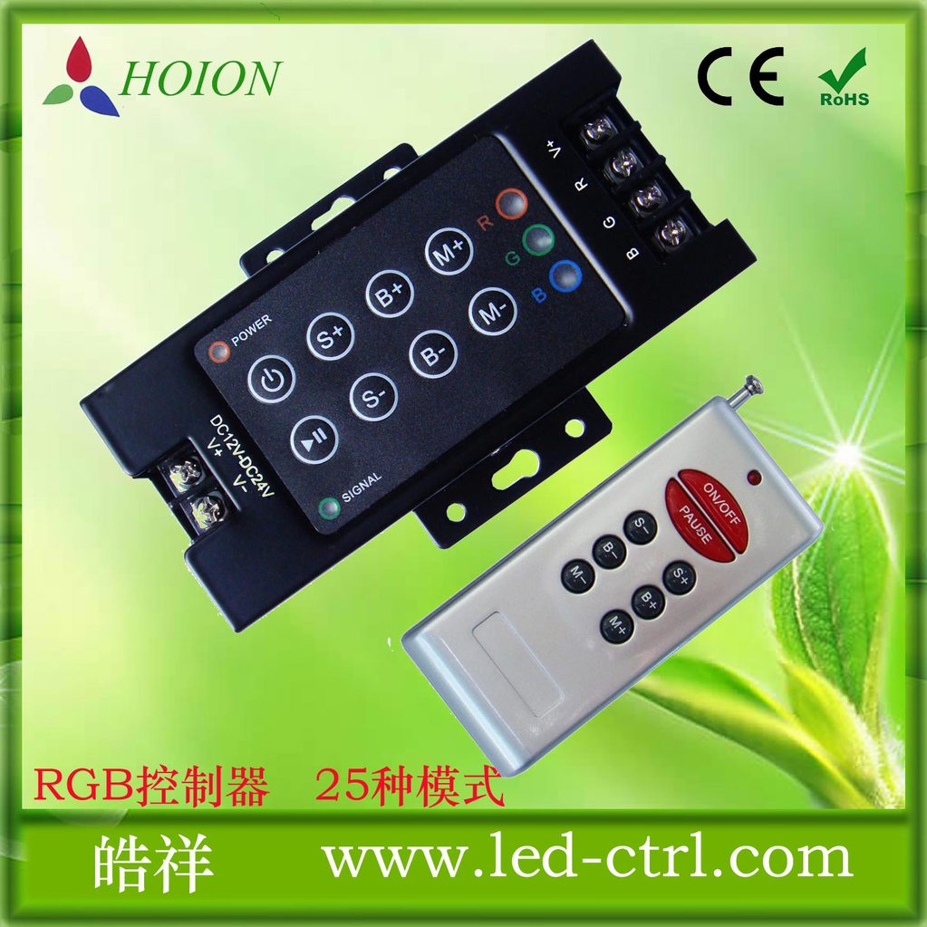 HX-RFL6A LED七彩控制器采用先進(jìn)的PWM控制技術(shù),用于控制各種能夠?qū)崿F(xiàn)RGB顏色變化的恒壓led燈具,例如:RGB LED燈條、LED模組、LED燈串等;電源屬于直流低壓輸入方式,輸出負(fù)載為四個(gè)接口,其中 V為公共極接口,另外三個(gè)為RGB控制接口;采用RF無(wú)線射頻遙控進(jìn)行模式選擇調(diào)節(jié),實(shí)現(xiàn)靜態(tài)、跳變、漸變、頻閃等燈光變化效果,同時(shí)客戶可根據(jù)實(shí)際需求對(duì)靜態(tài)顏色進(jìn)行亮度調(diào)節(jié),對(duì)動(dòng)態(tài)變化進(jìn)行速度調(diào)節(jié);并可以與本公司的RGB信號(hào)放大器進(jìn)行功率擴(kuò)展,實(shí)現(xiàn)更多LED燈的同步變化,理論上可以連接無(wú)數(shù)個(gè)RGB放大器。