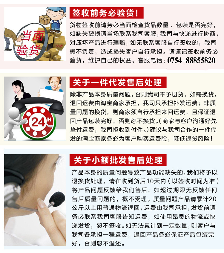 3、如遇要求退換貨情況,客戶必須保證貨物包裝完好,未經(jīng)使用,產(chǎn)品無損壞,不影響商品的二次銷售。(如退回貨物不符合標(biāo)準(zhǔn),本站將收取20%元手續(xù)費(fèi)),退換貨運(yùn)費(fèi)由買家承擔(dān)。