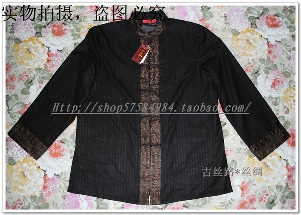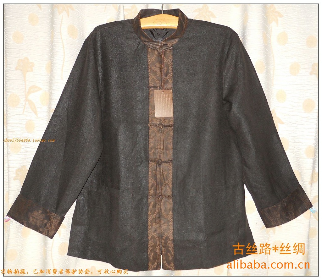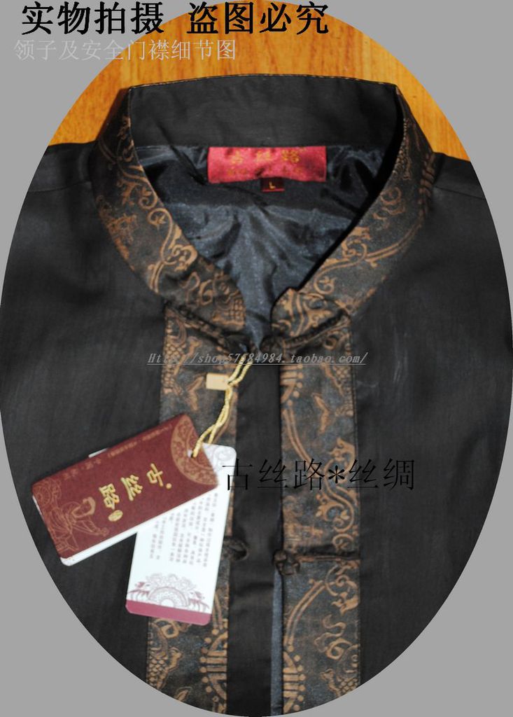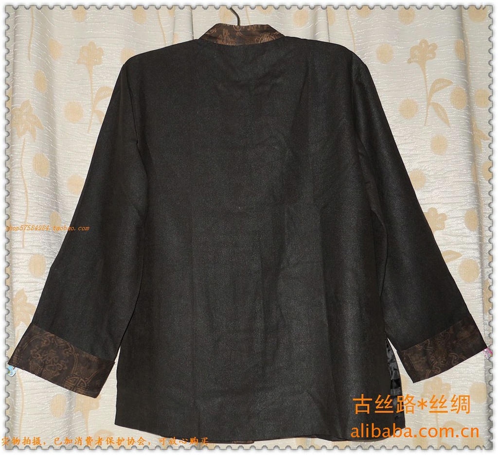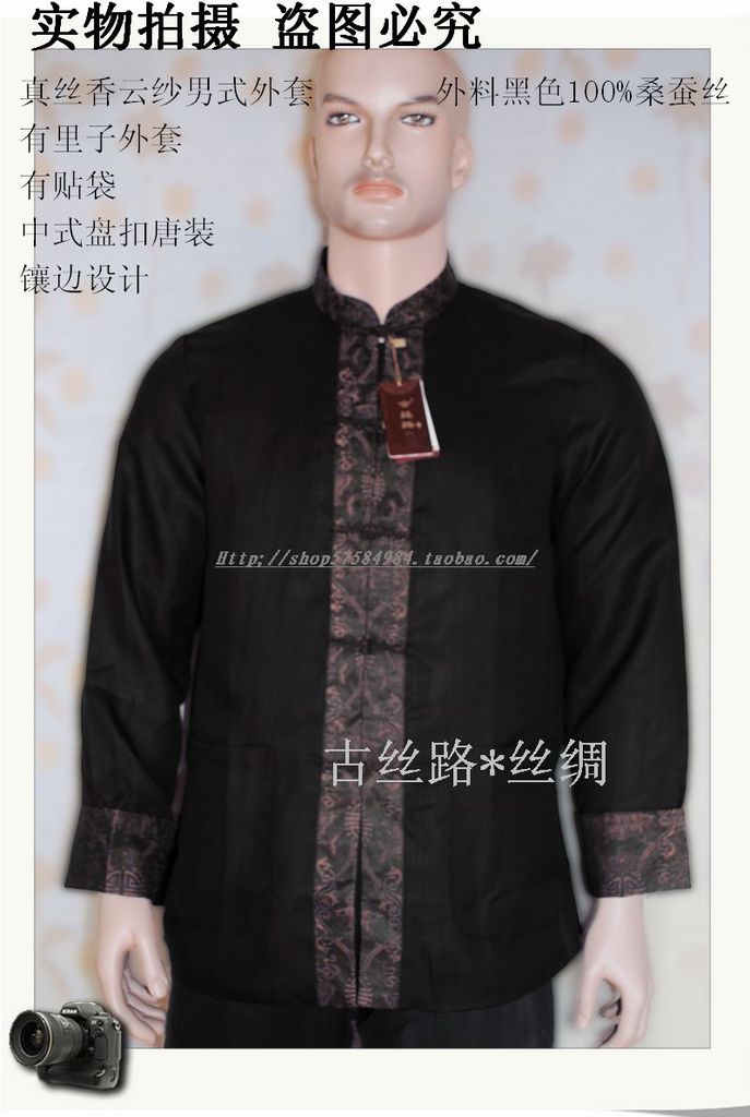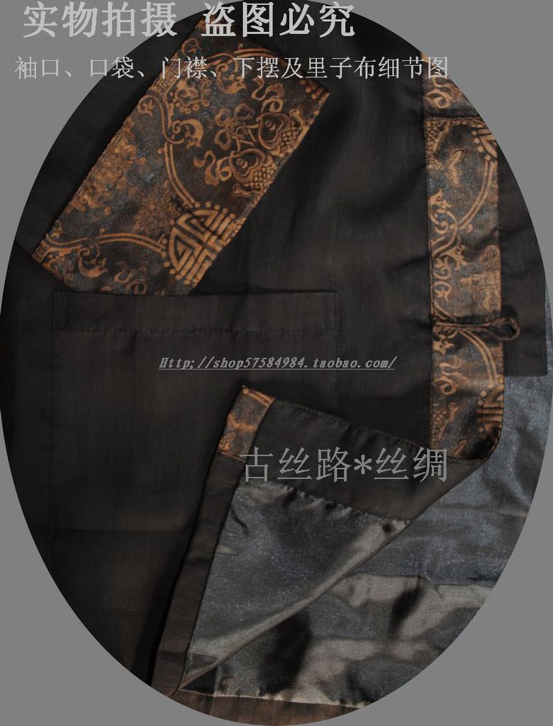 【面布】:真絲香云紗莨綢(100% SILK)---黑色鑲門襟唐裝(外套布料真絲香云紗--每批布料都會有點不同,隨機(jī)發(fā)貨)