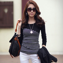 2014春裝新款女裝長袖t恤女 修身韓版圓領拼接條紋大碼打底衫¥26.00已售出2871件