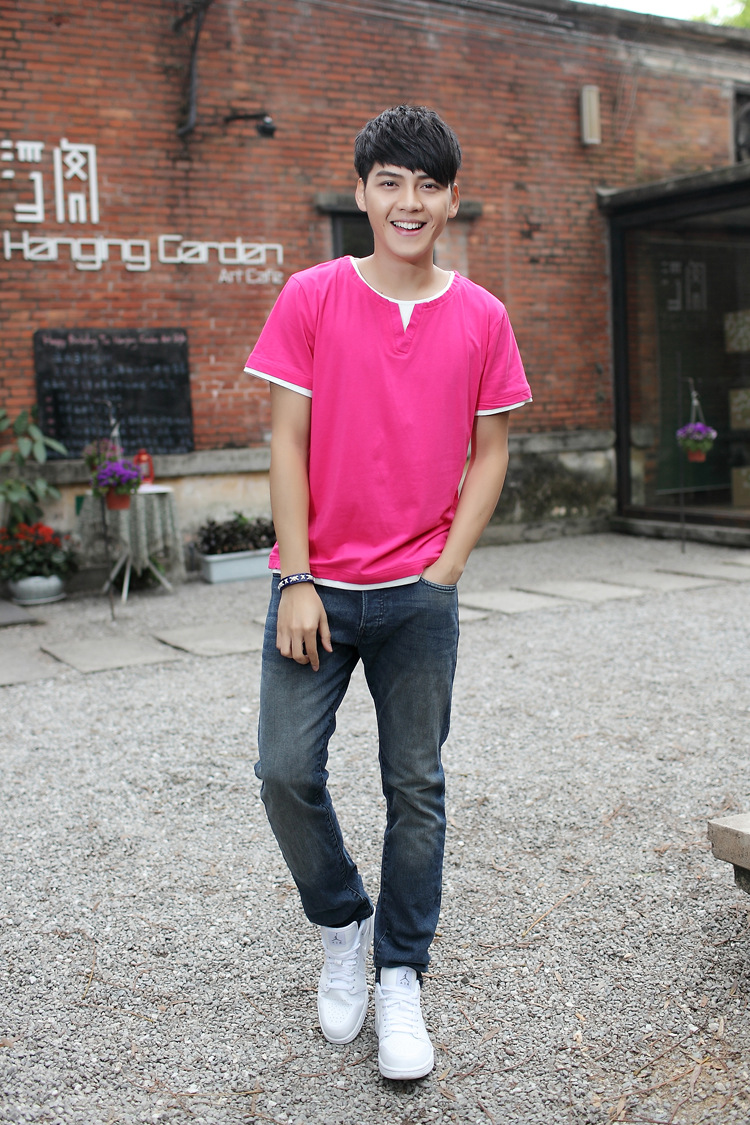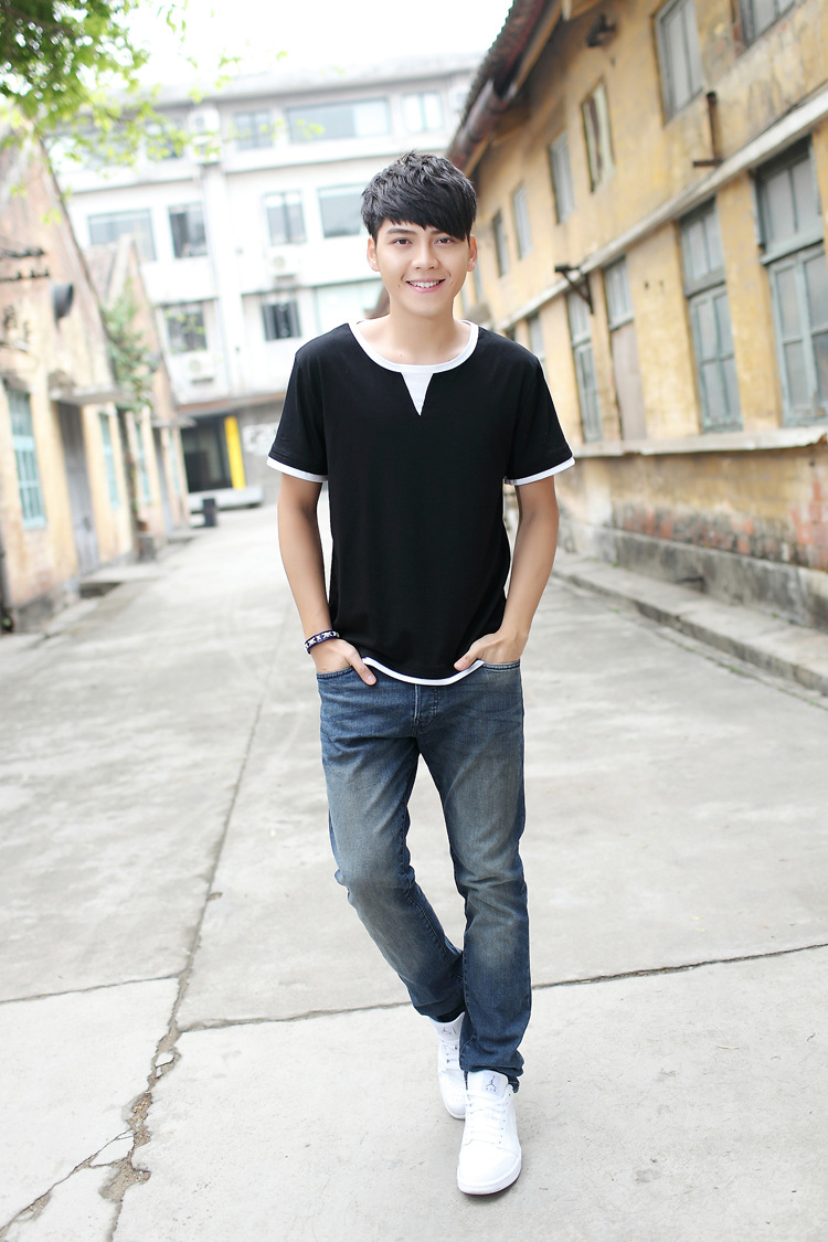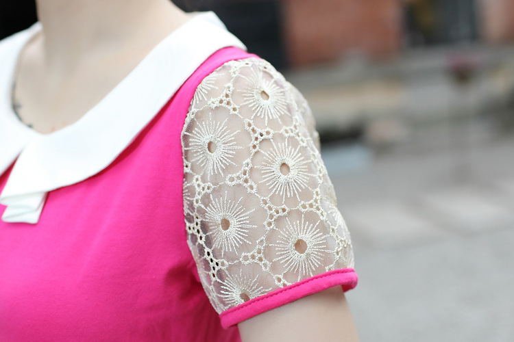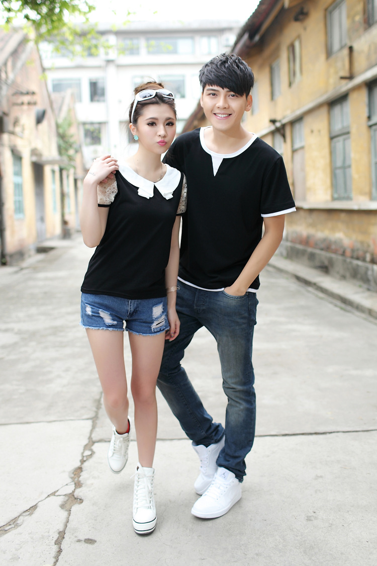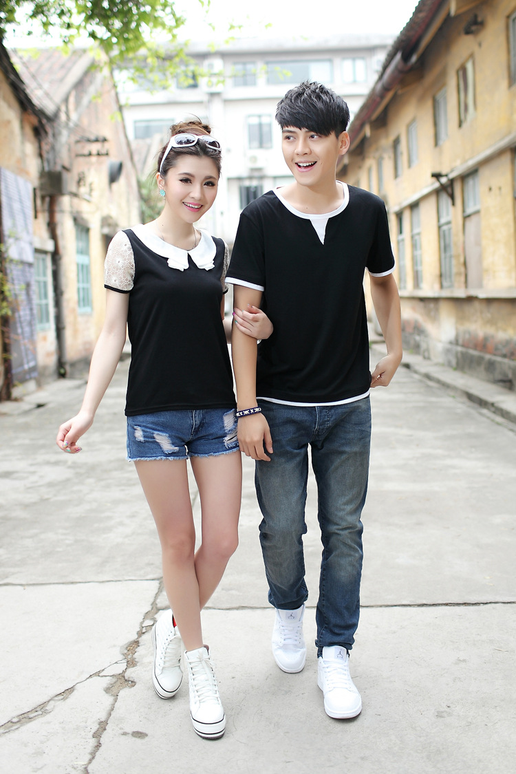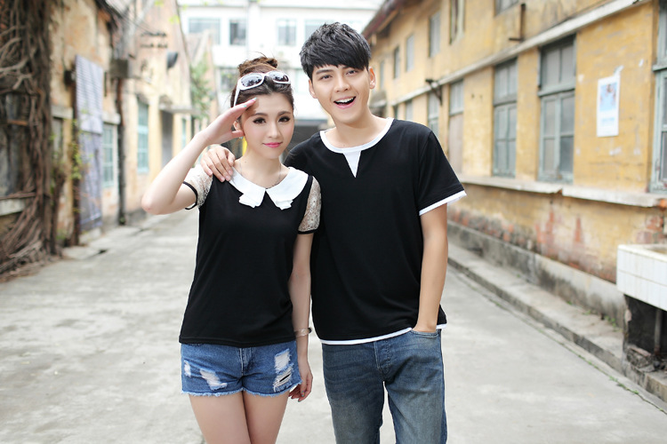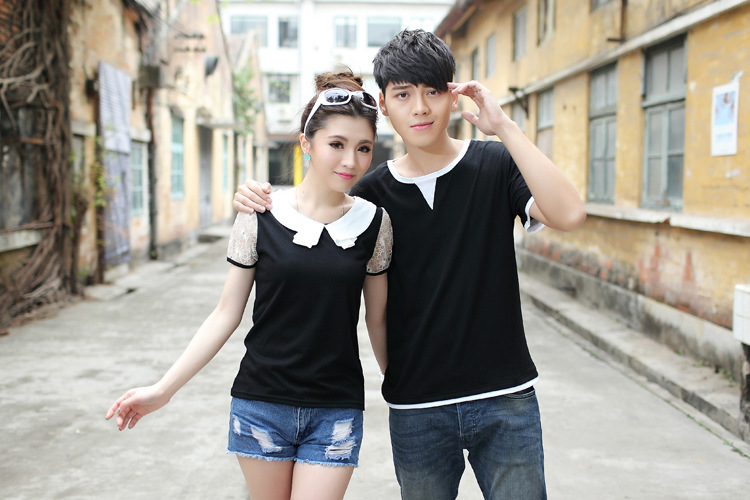 9221#(實拍)情侶裝夏裝 2015新款韓版娃娃領(lǐng)蕾絲夏季短袖T恤女