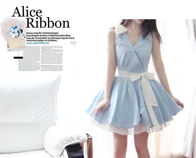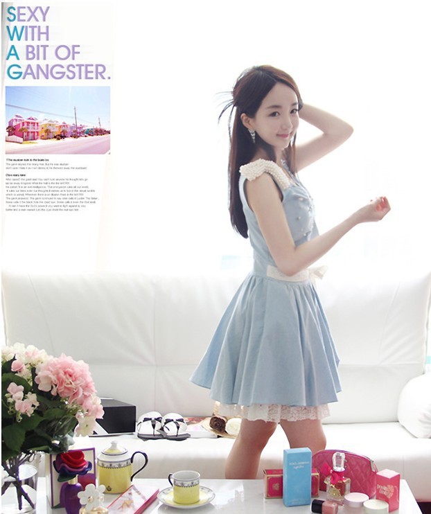 水洗淡藍(lán)色牛仔加甜美蕾絲。剛中帶柔小禮服的的版型更是襯托出可愛(ài)小女人的氣質(zhì)。淡藍(lán)色的牛仔加上賦予女性蕾絲下擺和珍珠裝飾.浪漫.推薦推薦 肩上蝴蝶結(jié)可以拆卸呢