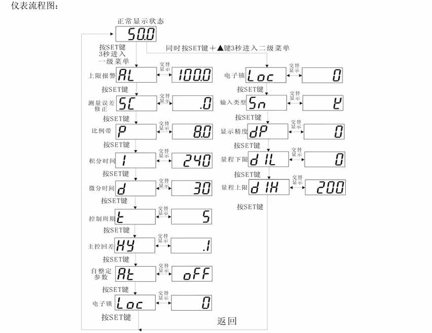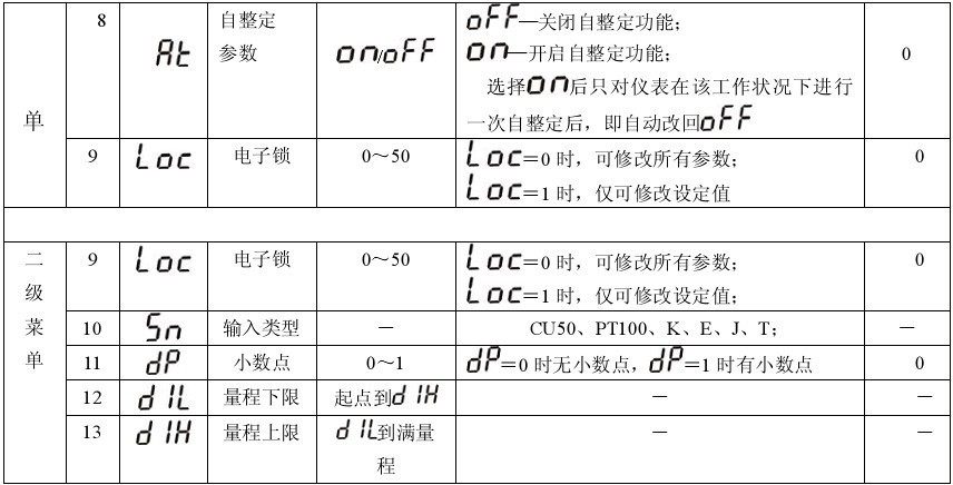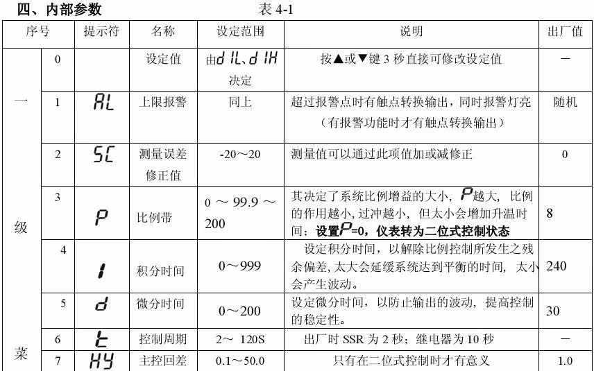 按SET鍵 3秒進(jìn)入一級菜單,顯示窗交替顯示參數(shù)符號和參數(shù)值,按▲鍵或▼鍵修改,長按鍵可實現(xiàn)快速加或減。修改完成后,按SET鍵保存進(jìn)入下一參數(shù)設(shè)置。不按任何鍵,10秒后自動保存退出。