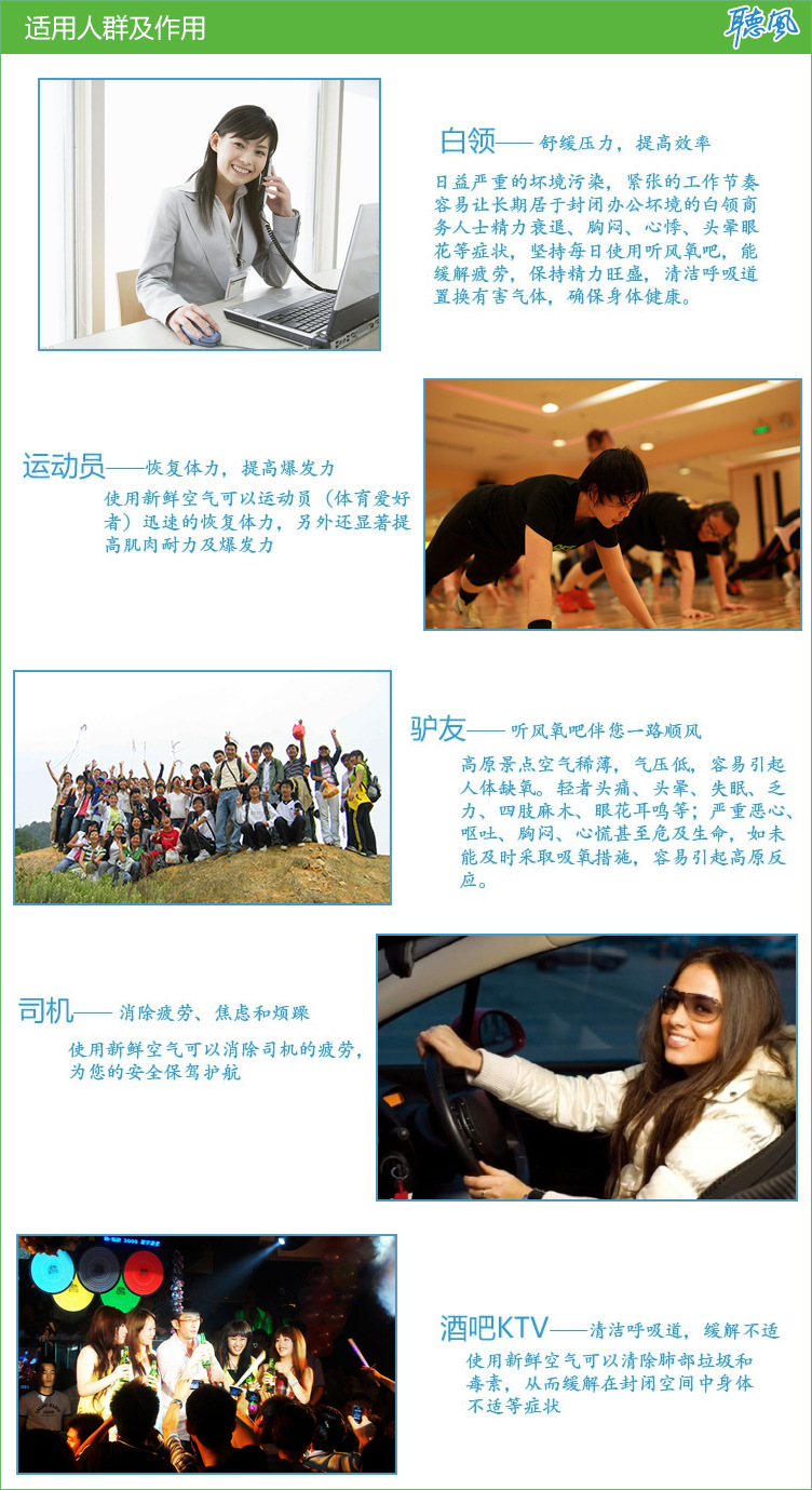 6、休閑旅游:在卡拉OK、迪斯高舞廳、網(wǎng)吧、酒吧、桑拿中心等各種娛樂休閑場(chǎng)所使用,隨時(shí)隨地享受新鮮空氣;亦可用于煙酒過度后清醒神志,具解酒之功效,也可在旅游過程中補(bǔ)充體內(nèi)氧氣含量,解除疲勞狀態(tài),清醒頭腦。