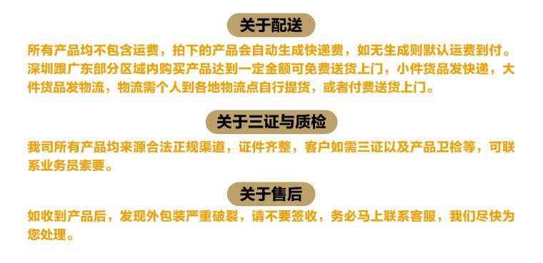 本店所有產(chǎn)品默認(rèn)運(yùn)費(fèi)為中通快遞,需要發(fā)物流的客戶拍下產(chǎn)品后請(qǐng)通知客服更改運(yùn)費(fèi),我們不收取物流費(fèi)用,運(yùn)費(fèi)統(tǒng)一到付,由客戶自行交付給物流公司(物流件需要客戶親自上門提貨,或額外收取費(fèi)用送貨上門)!