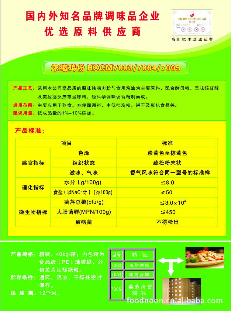 產(chǎn)品特點(diǎn):采用山地放養(yǎng)雞經(jīng)科學(xué)熬煮、水相抽提、真空濃縮、噴霧干燥精制而成,保留雞的原汁原味香原色,肉香型,純正濃郁的煮雞風(fēng)味,蛋白質(zhì)≥40%。