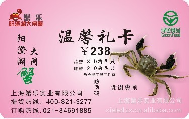 陽(yáng)澄湖大閘蟹禮卡8只裝9折促銷中,熱線:400-821-3277