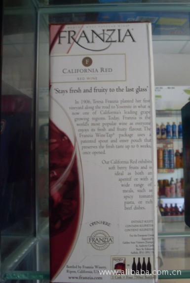 今天,F(xiàn)ranzia的業(yè)務(wù)和她女婿Emest Gallo的業(yè)務(wù)共占了美國國內(nèi)釀造的飲料的超過50%的份額。在1978年Franzia革命性的“永保新鮮”品牌Winetap首次亮相。為了避免只剩下的半瓶飲料和空氣接觸,F(xiàn)ranzia的的內(nèi)部袋裝設(shè)計保證了每一杯飲料都是那么新鮮。而且它的恰到好處的容量剛好可以裝滿四個標(biāo)準(zhǔn)瓶。當(dāng)我們進入制造的第二個紀(jì)元,我們努力秉承Teresa Franzia遺留下來的品質(zhì)、鮮香,以至可以讓我們能享受到每一杯給我們帶來的快樂.