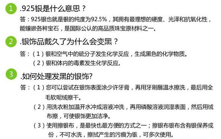 5、銀飾發(fā)黃得嚴(yán)重,用洗銀水浸泡的時(shí)間不宜過(guò)長(zhǎng),一般數(shù)秒鐘,取出后立即用清水清洗,然后用面紙吸干。