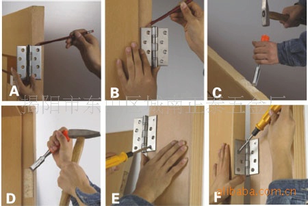 在門框上用兩個(gè)螺釘固定一個(gè)合頁(yè)。