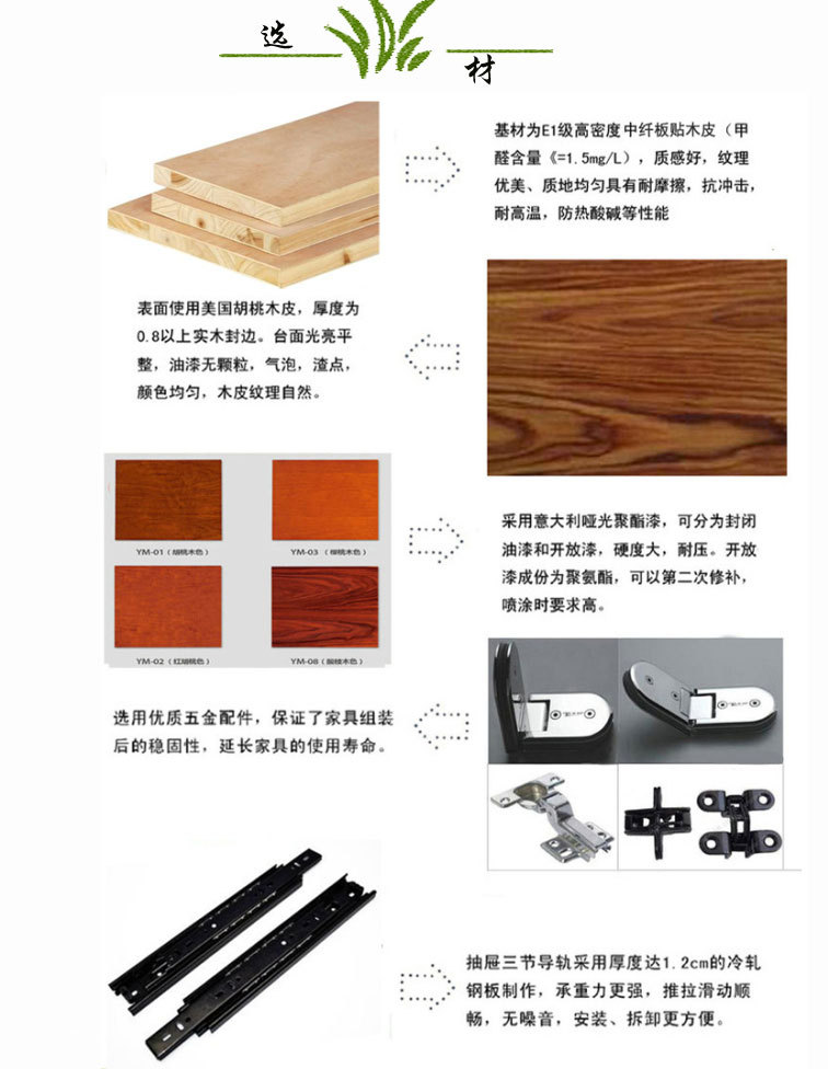 2、基材:采用優(yōu)質(zhì)高密度中纖板制作,甲醛釋放量達(dá)E1級環(huán)保,經(jīng)防蟲防腐處理;