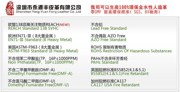 答:目前的人造革與合成革,都會添加化學產(chǎn)品,生產(chǎn)過程中都含有一定的化學元素存在,在某一方面來講也是屬于有害物質(zhì)?,F(xiàn)時科學技術仍未能達到100%無毒, 但是我們都是能通過歐美出口標準的,2011年我司投產(chǎn)的全水性人造革幾乎能做到100%無毒,能出口到歐洲對環(huán)保要求最嚴格的國家,我司致力于環(huán)保革的生產(chǎn)與銷信,能為環(huán)保出一份力 ,是我們的榮幸。