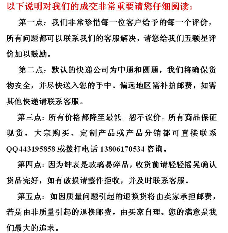 光臨選購(gòu)。為了您的購(gòu)物旅途愉快,請(qǐng)您看完以下信息:我店從事鐘表實(shí)體批發(fā)20余年,剛嘗試網(wǎng)絡(luò)銷(xiāo)售,不足之處還請(qǐng)您多多諒解。謝謝!!