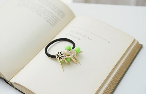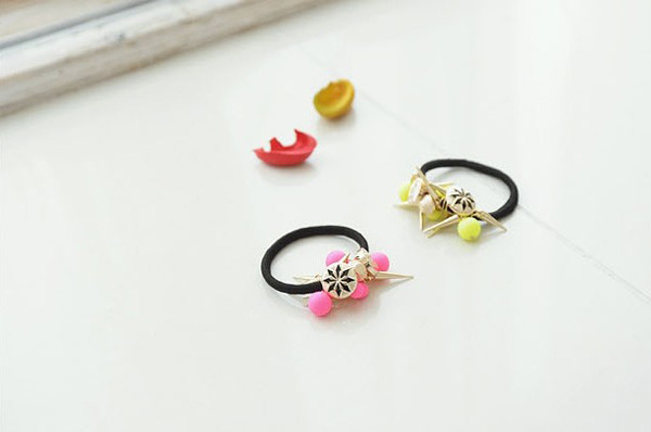韓國進(jìn)口發(fā)飾品頭飾正品馬尾繩潮款熒光色鈕扣鉚釘發(fā)圈頭繩