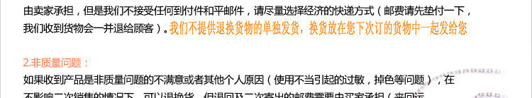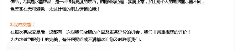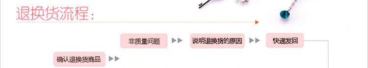 申明:質(zhì)量問(wèn)題的定義為由于產(chǎn)品的制做或者組裝過(guò)程中的失誤而造成飾品完全不能佩戴的問(wèn)題。具體情況包括以下幾種:嚴(yán)重生銹、斷裂、大面積變色掉色、掉鉆、少配件等嚴(yán)重影響佩戴的問(wèn)題。而不影響佩戴的小瑕疵希望顧客能給予一定的理解,飾品有著時(shí)尚,流行的特點(diǎn),存在一些不影響佩戴的瑕疵在所難免。我們不承諾對(duì)于小瑕疵給予退換。