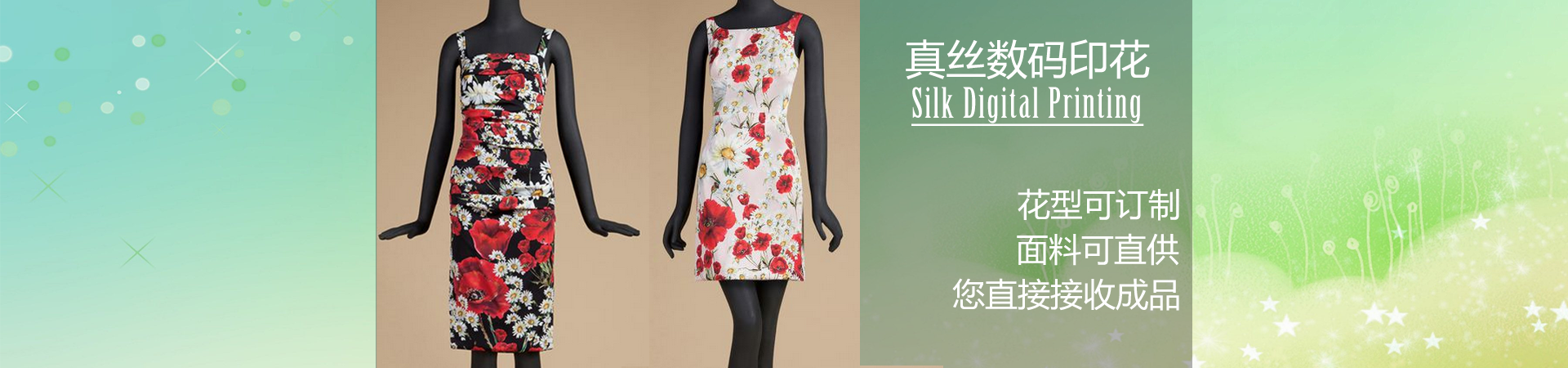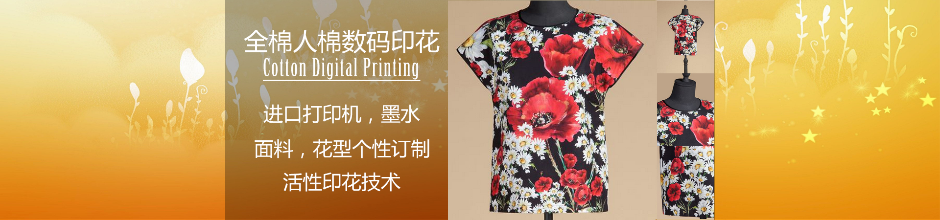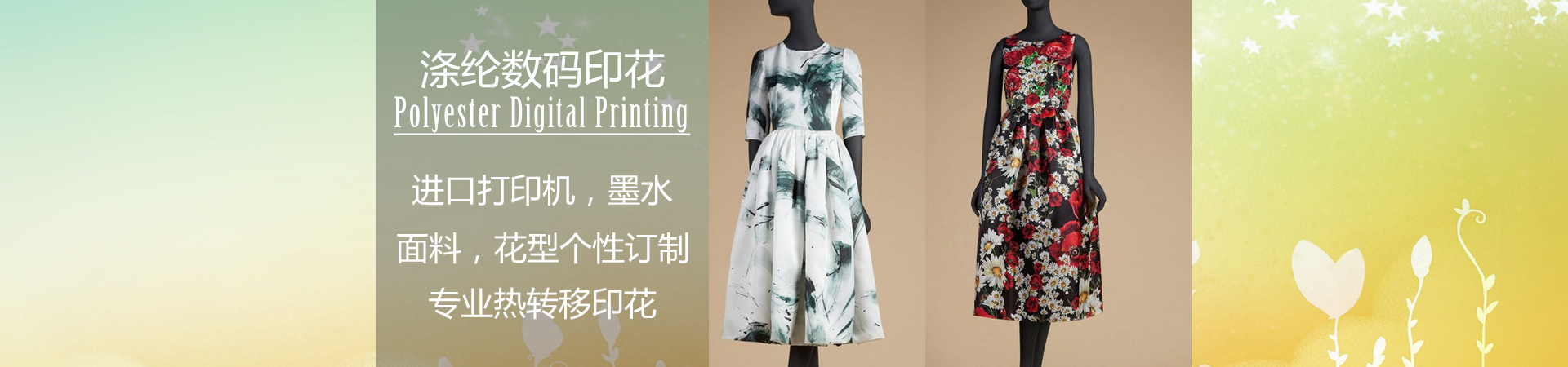 公司從事各類紡織面料的數(shù)碼印花加工,適用于活性、分散、酸性及涂料的數(shù)碼印花,主要針對多品種、小批量印花訂單生產(chǎn)及各種清晰度寫真花型加工??梢栽诟鞣N紡織面料上直接印制任意色彩的寫真圖案。數(shù)碼印花產(chǎn)品廣泛應(yīng)用于服裝(旗袍)、服飾、圍巾絲巾、手袋箱包、家用紡織品、戶外休閑用品、汽車飾品、無紡布、寫真照片、工藝畫、廣告畫、掛旗等產(chǎn)品。提供數(shù)碼轉(zhuǎn)移印花、數(shù)碼活性印花、 調(diào)色分色、 花型設(shè)計(jì)、 批量打樣,為客戶提供快捷的印花服務(wù),并提供全方位高品質(zhì)的數(shù)碼印花產(chǎn)品。