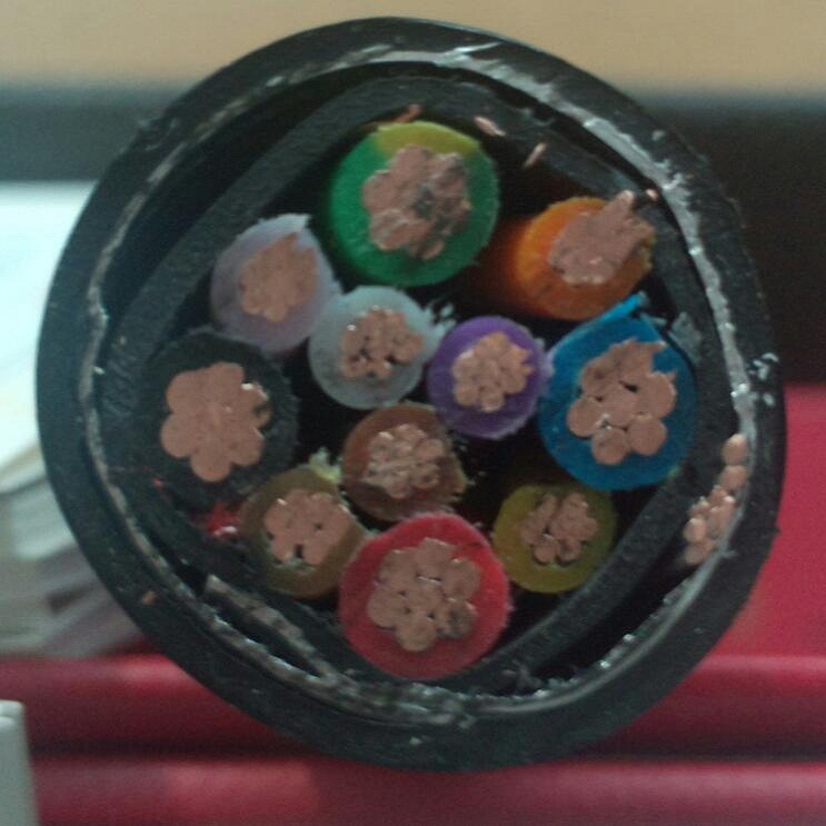 of stranded, insulated conductors with nonhygroscopic and nonwicking filler in a core of moisture- and flame-resistant nonmetallic material overlaid with a metallic covering and jacketed with a moisture-, corrosion-, and sunlight-resistant nonmetallic material.