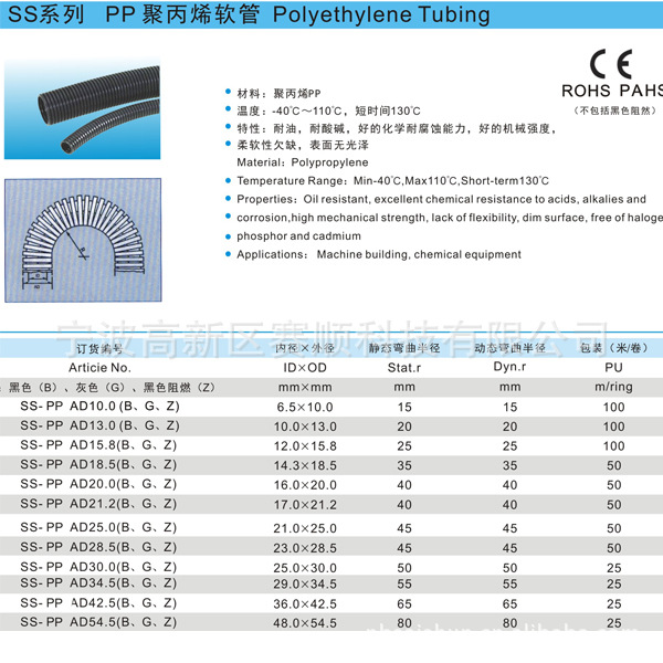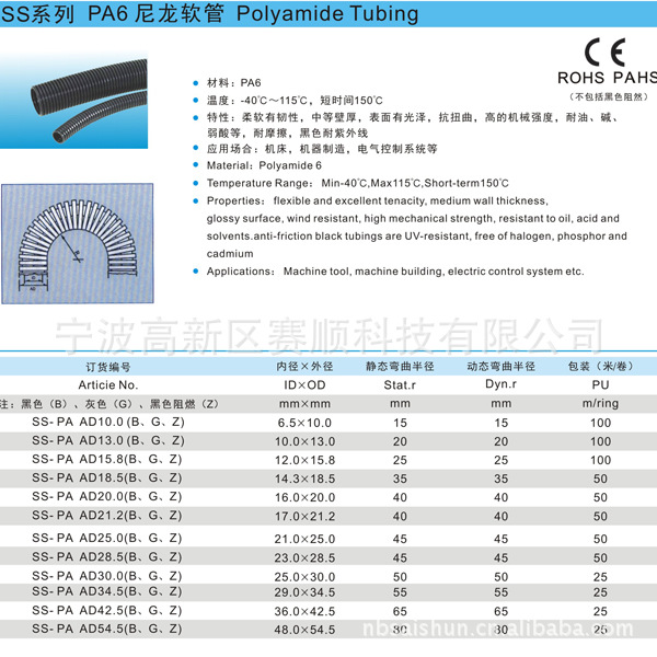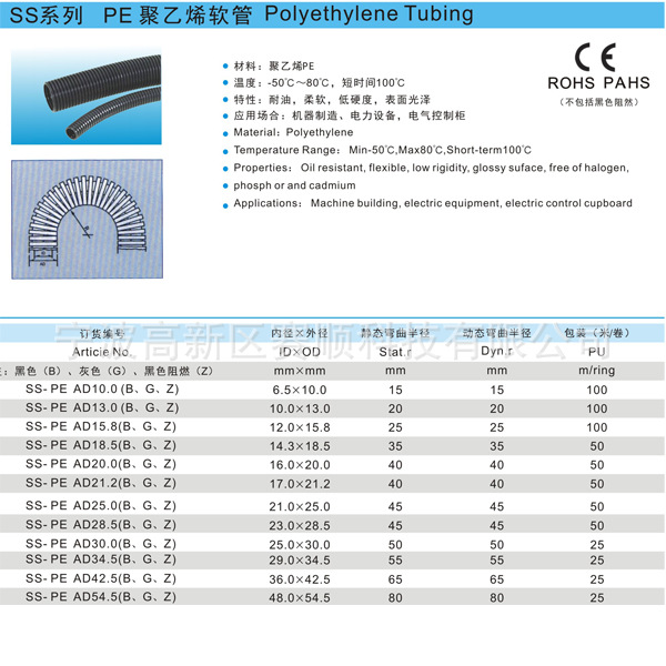 3)特性:柔軟有韌性,中等壁厚,表面有光澤,抗扭曲,高的機(jī)械強(qiáng)度,耐油、堿、弱酸等,耐摩擦,黑色耐紫外線等。