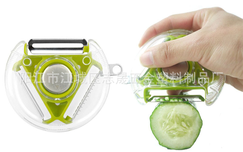 1,三合一多功能削皮器,廚房必備的瓜果去皮利器;三向旋轉(zhuǎn)刀片設計,涵蓋常見瓜果刨皮功能。