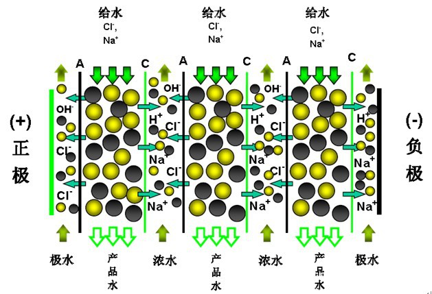 在EDI設(shè)備中,進(jìn)水中的各種離子通過樹脂后被脫除,水得到了純化,此時是利用離子交換原理來脫除水中的離子。由于離子交換膜兩邊加有電壓,水分子被電解為H 和OH-離子去再生樹脂,同時被H 和OH-離子交換下的離子在穩(wěn)壓穩(wěn)流電源的作用下,被遷移到濃水室排放,從而實(shí)現(xiàn)連續(xù)再生連續(xù)使用目的。