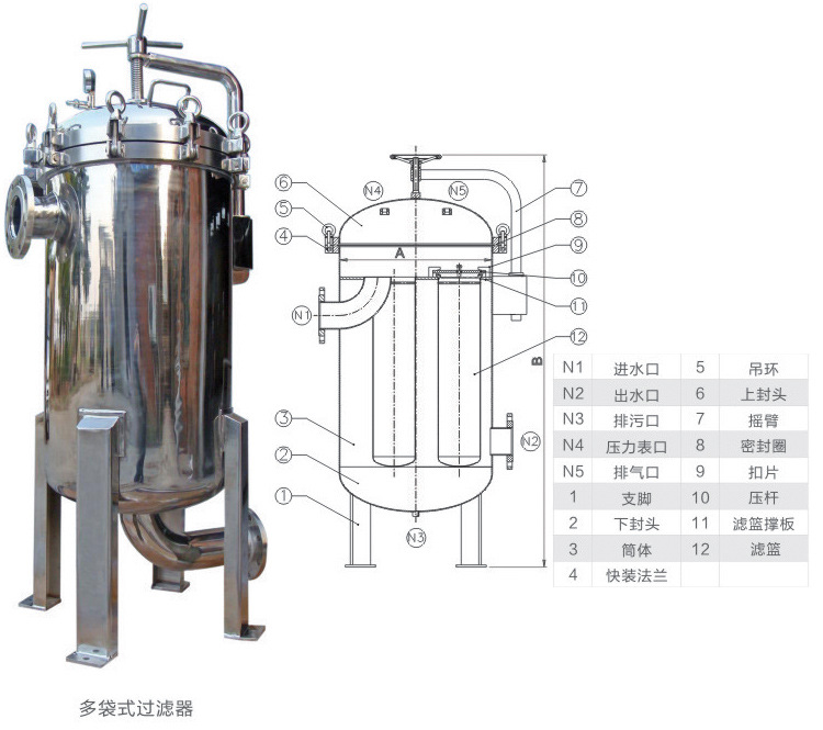 袋式過濾器是一種結(jié)構(gòu)新穎、體積小、操作簡便靈活、節(jié)能、高效、密閉工作、適用性強(qiáng)的多用途過濾設(shè)備,過濾器內(nèi)部由金屬網(wǎng)籃支撐濾袋,液體由入口流進(jìn),經(jīng)濾袋過濾后從出口流出,雜質(zhì)則被攔截在濾袋中。濾袋可更換或清洗后繼續(xù)使用。