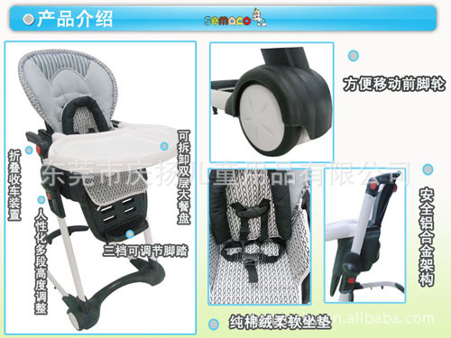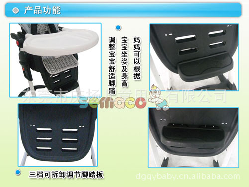 產(chǎn)品特性:座椅位置可調(diào)節(jié) 高度可調(diào)節(jié) 餐盤可調(diào)節(jié) 座位傾仰可調(diào)節(jié)