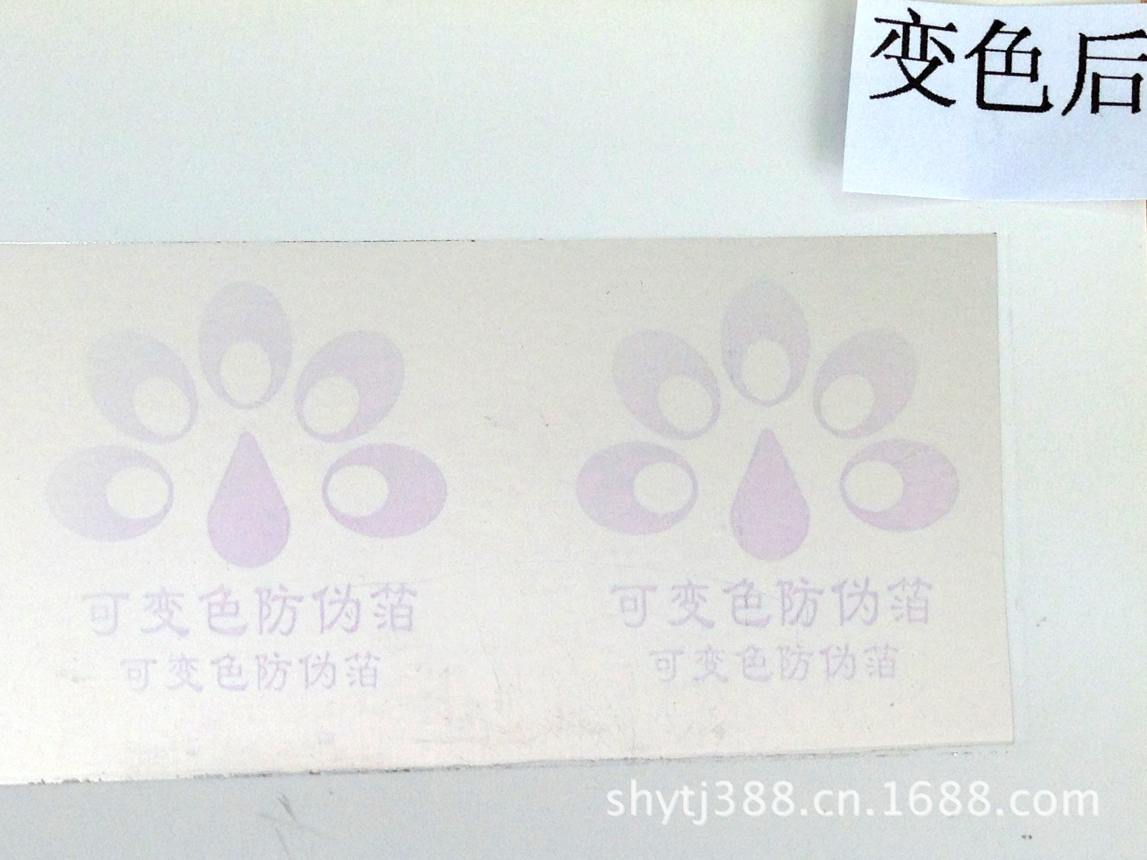獨有功能:在太陽光或紫外光照射下能呈現(xiàn)出各種圖案、商標、文字。離開光源各種圖案、商標、文字消失仍恢復(fù)原來精美的電化鋁燙印效果。