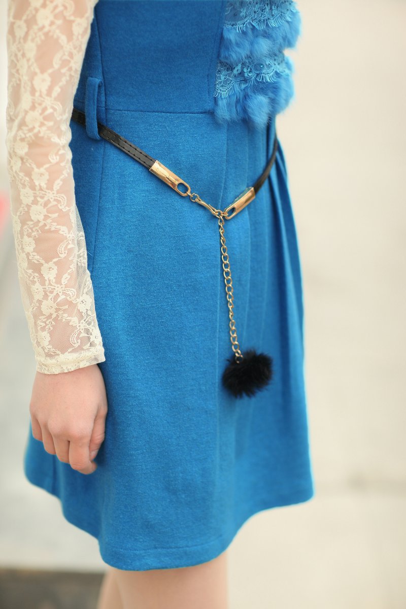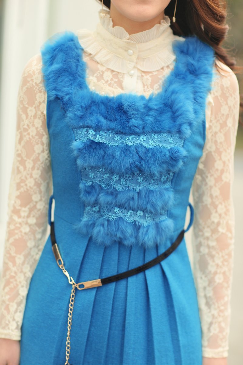 韓版拼兔毛無袖連衣裙