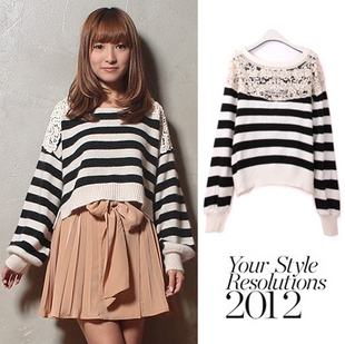 2012秋冬新款條紋水溶蕾絲鉤花拼接鏤空短款長(zhǎng)袖針織衫 罩衫 女