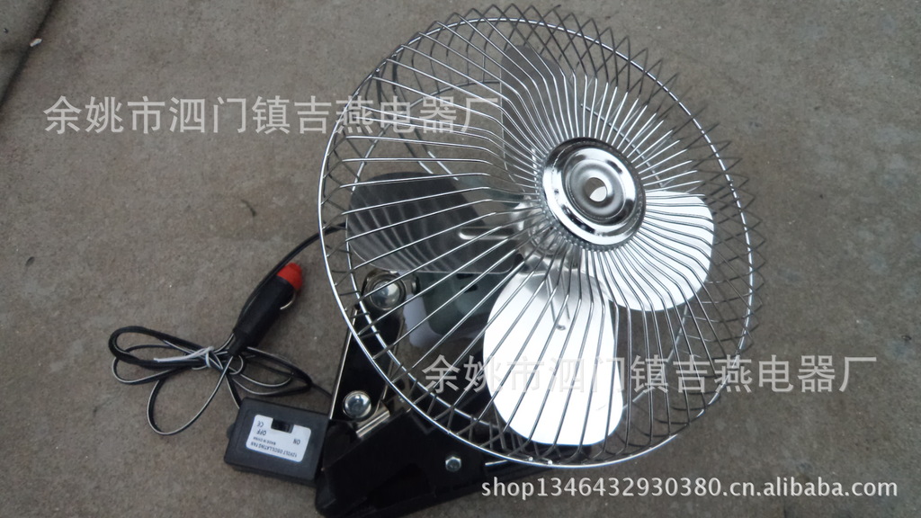 本款風(fēng)扇由鍍鉻網(wǎng)罩(噴塑)、鐵扇葉、12/24V電機(jī)、鍍鎳支架、帶點(diǎn)煙器的電線等部件組成,有撥桿控制風(fēng)扇搖頭。