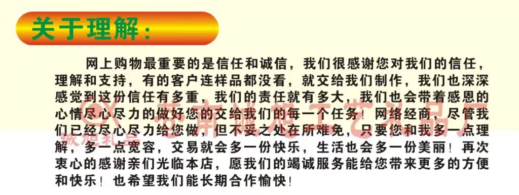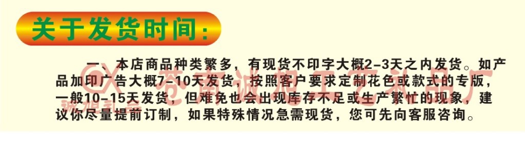 因?yàn)楸竟臼桥l(fā)訂做廠家,時(shí)間上可能會(huì)有點(diǎn)慢,請(qǐng)買家不要以時(shí)間慢、物流慢之類向我們少錢或退貨,像有些想貧小便宜的買家請(qǐng)繞道謝謝!