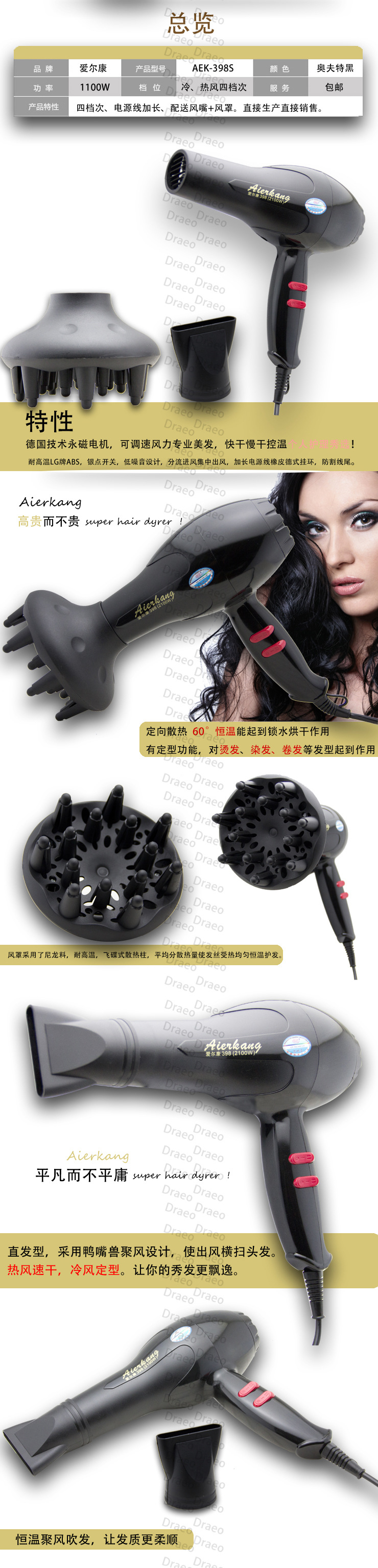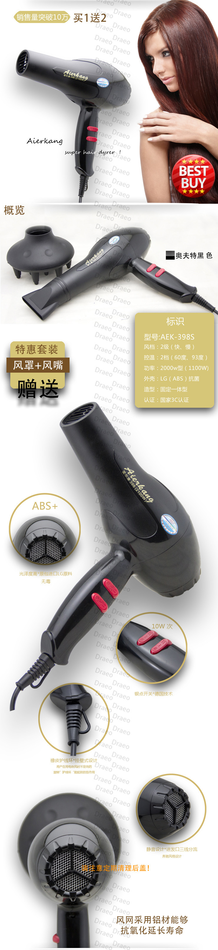 廠家直銷(xiāo)愛(ài)爾康吹風(fēng)淘寶熱銷(xiāo)電吹風(fēng)398X 配送風(fēng)嘴風(fēng)罩