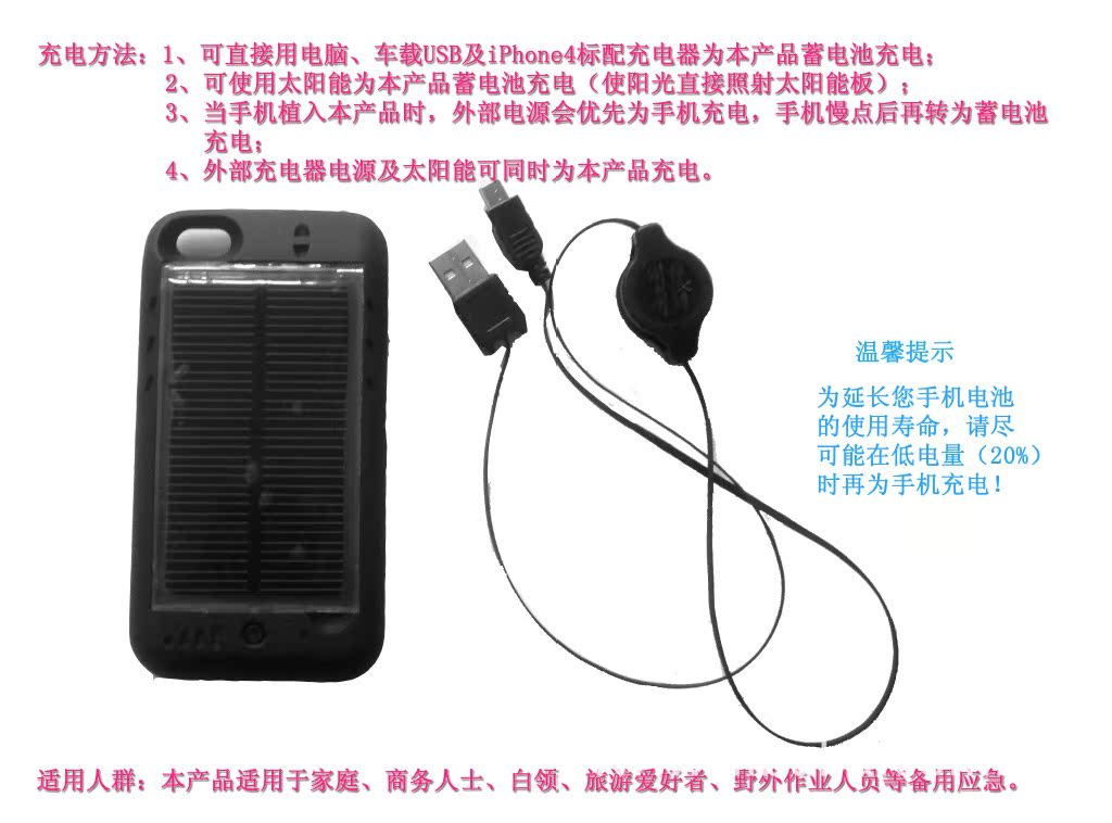 1、 可直接用電腦、車載USB及Iphone4標(biāo)配充電器為本產(chǎn)品蓄電池充電;5~6小時(shí)即可充滿。