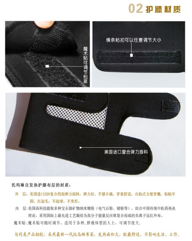 遠(yuǎn)紅外負(fù)離子熱能護(hù)膝采用巴西寶石托瑪琳、納米功能陶瓷粉及特殊的熱感應(yīng)材料復(fù)合而成。在人體體溫的激發(fā)下,通過轉(zhuǎn)移觸媒的作用,熱感應(yīng)材料即時(shí)反應(yīng)放出熱量。